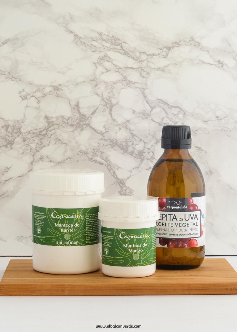 Como te he dicho para hacer una Body Butter únicamente necesitarás aceites y mantecas, en esta receta he utilizado aceite de Pepita de Uva, manteca de Karité y manteca de Mango.