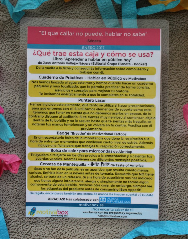 Un detalle que me gustó mucho, además de la frase que contiene de Séneca, es que con estas cajas se colabora con Aldeas Infantiles ¡gran iniciativa!