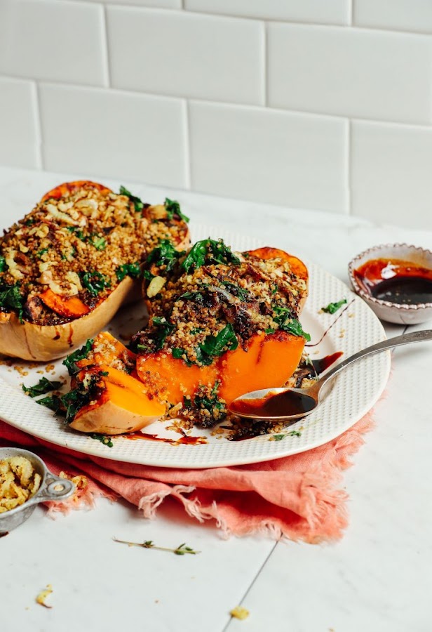 Una vez que su calabaza esté asada, coloque el lado de corte sobre la bandeja para hornear o el plato y rellene hasta el borde con el relleno de quinoa. Luego vuelva a colocar en el horno para asar otros 5 minutos.