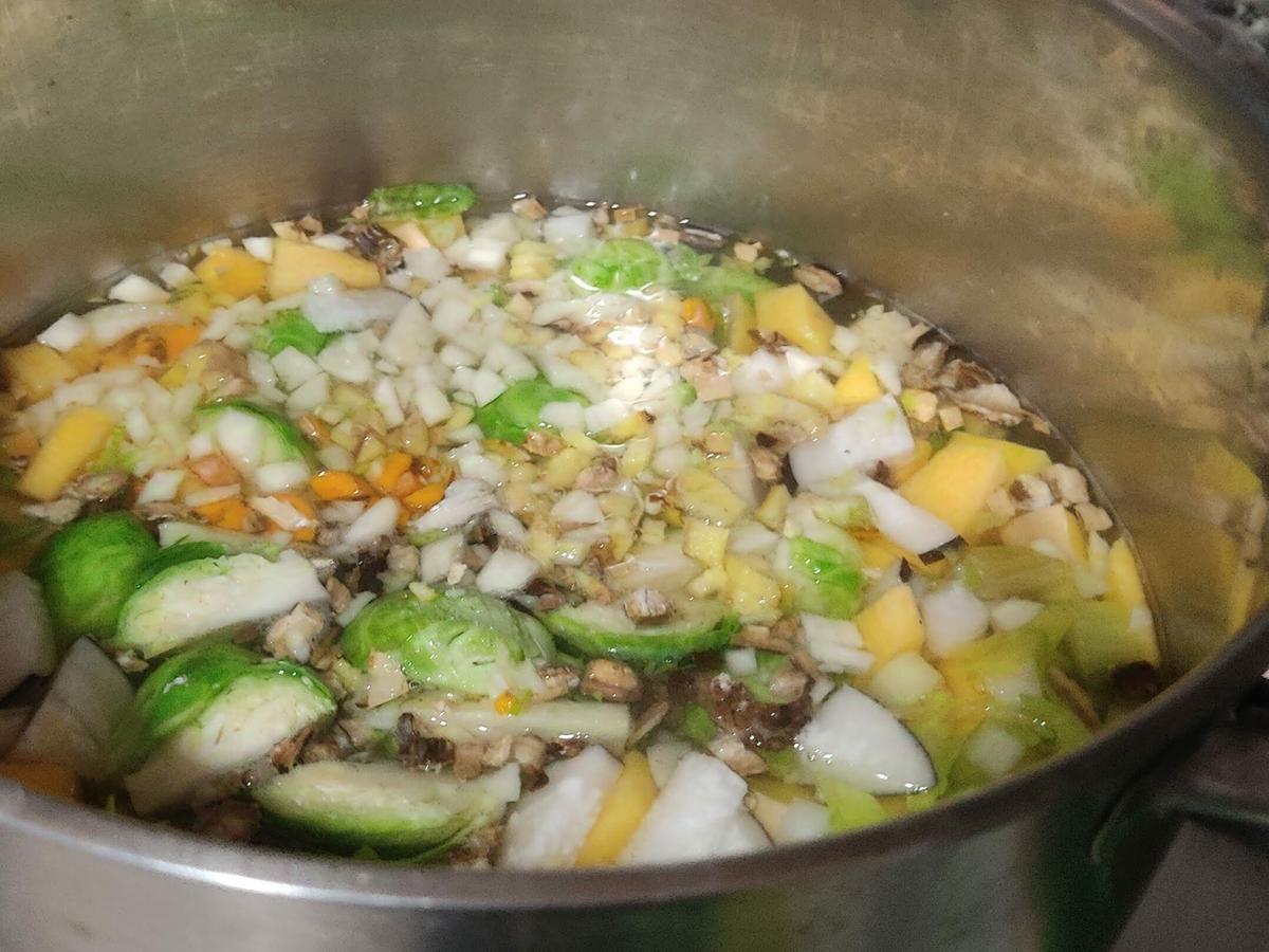 Mete en una olla el apio, las zanahorias, el jengibre, la cúrcuma, las cebollas, el cilantro y los ajos pelados y picados en una olla con 3 litros de agua, agreaga la raíz de bardana seca y la calabaza cortada en cuadraditos.
