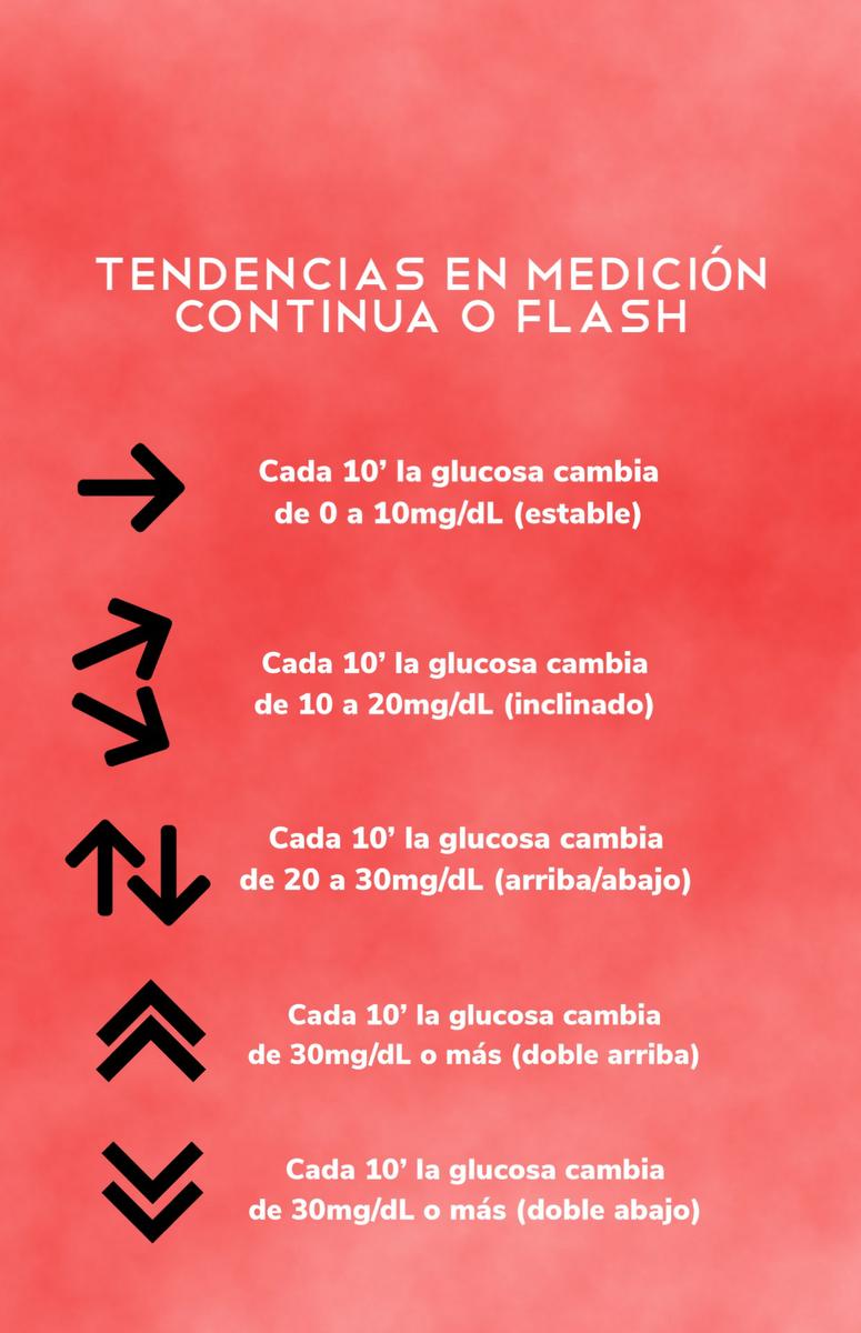 Las tendencias indican hacia donde va la glucosa y al tomar decisiones es importante no solo ver el dato puntual si no como ha sido la curva de glucosa y hacia donde se dirige ésta. Os dejo una imagen que he hecho para que veáis cuánto cambia la glucosa en función de la tendencia.