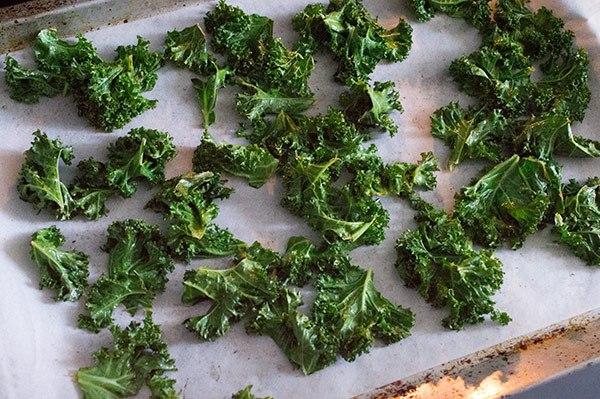 En una bandeja de horno colocamos papel de hornear y las hojas de kale sin que se toquen demasiado para que así se tuesten bien.