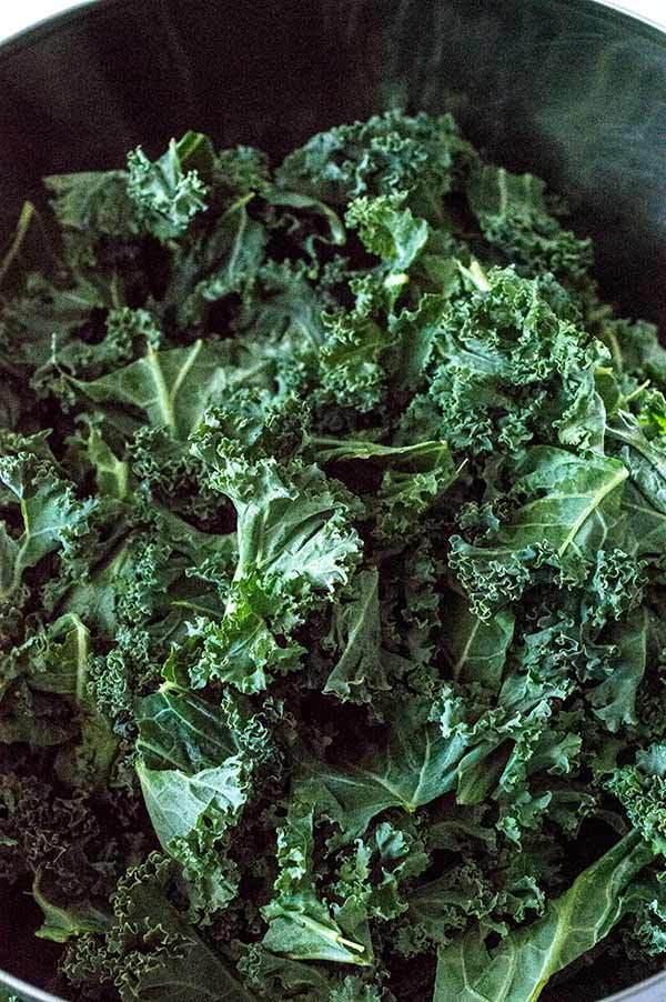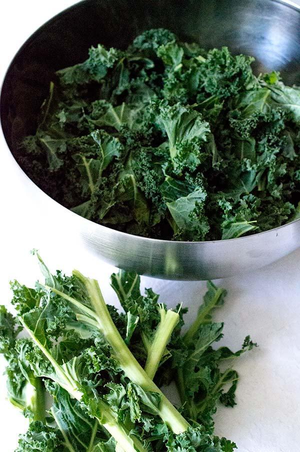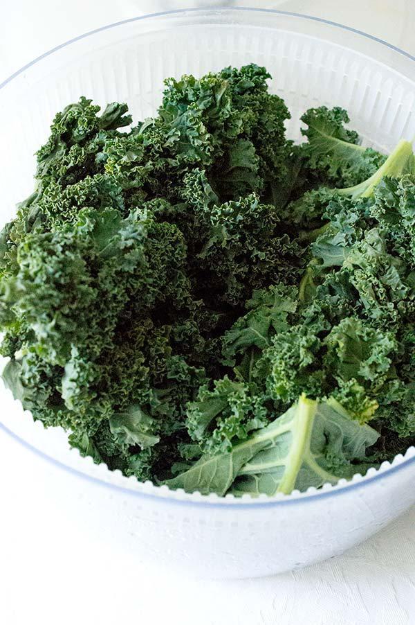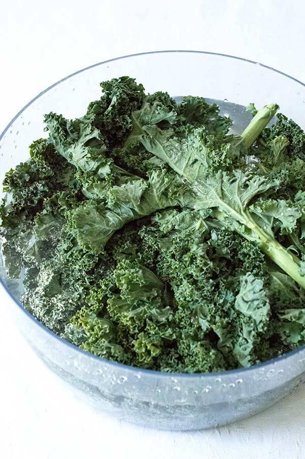 Lo primero de todo es lavar bien la col kale, así que la sumergimos en abundante agua.
