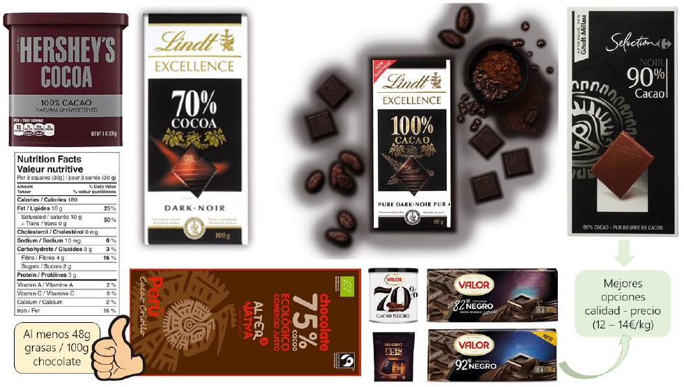 Por ello, aunque no existe ley al respecto en la actualizar, se empieza a plantear la posibilidad de obligar legislativamente a incluir la concentración de polifenoles (con especial atención a los flavanoles). Hasta entonces, las mejores alternativas para elegir cacao podrían ser (Figura 9):