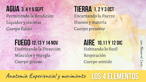 Solos o en pareja, mediante manipulaciones corporales y propuestas específicas de contacto respetuoso, activaremos cada uno de los 4 Elementos en nuestra anatomía. Esto irá seguido de un espacio para el movimiento, la conciencia y la integración, la reflexión y el compartir.