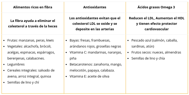 La alimentación juega un papel muy importante en los niveles de colesterol, si quieres reducir el nivel de LDL y elaborar un menú para subir el colesterol bueno, ten en cuenta los alimentos de la siguiente tabla.