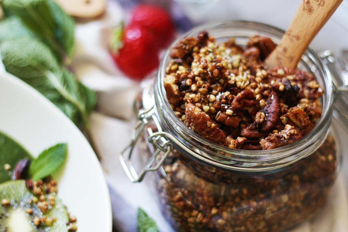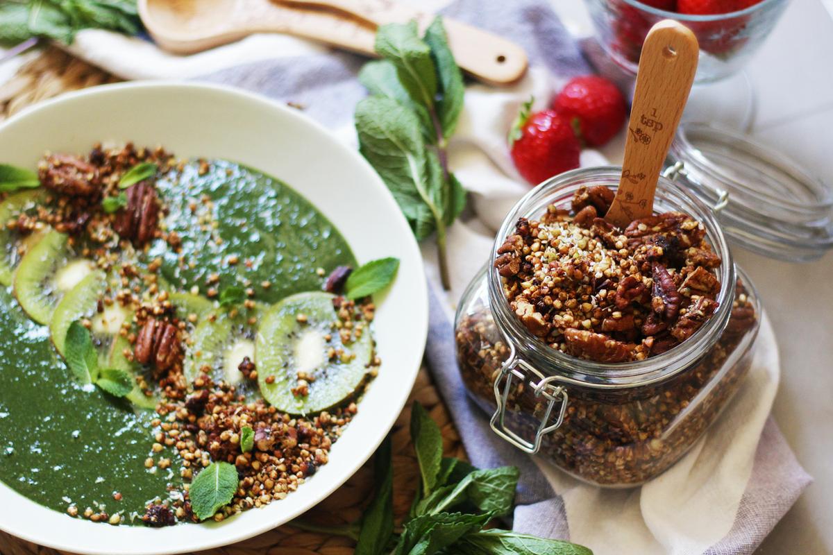 Hoy te traigo una combinación de escándalo, un batido verde servido con granola supercrujiente y sin gluten de nueces pecanas y trigo sarraceno. ¿Te vienes a desayunar conmigo?