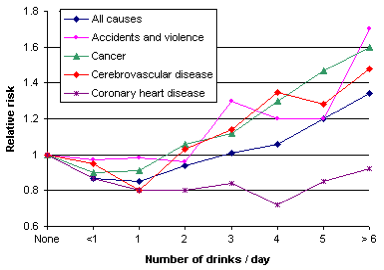 Por si esto fuera poco, existe una relación clara entre el número de bebidas alcohólicas que se toman al día y el riesgo de morir por diferentes causas.