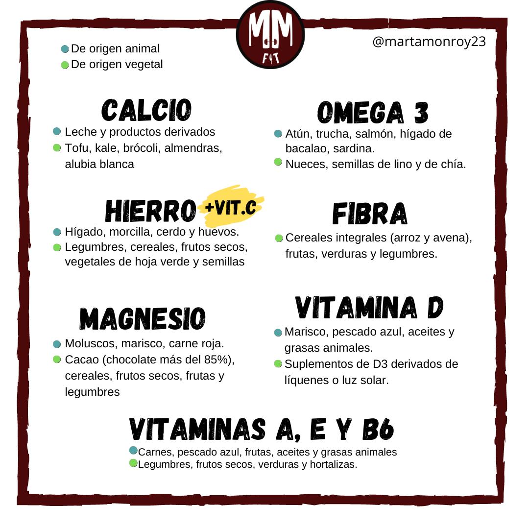 El consumo de hierro debe estar presente y, especialmente, para actuar en casos de anemia con alimentos que ayuden a aumentar su absorción, así como la vitamina C. Además, si realizas ejercicio habitualmente o eres deportista, debes tener en cuenta este aspecto para prevenir alteraciones en tu ciclo menstrual, la llamada “triada de la atleta”. Alimentos de origen animal: hígado, morcilla, cerdo y huevos; y de origen vegetal: legumbres, cereales, frutos secos, vegetales de hoja verde, productos fortificados y semillas.