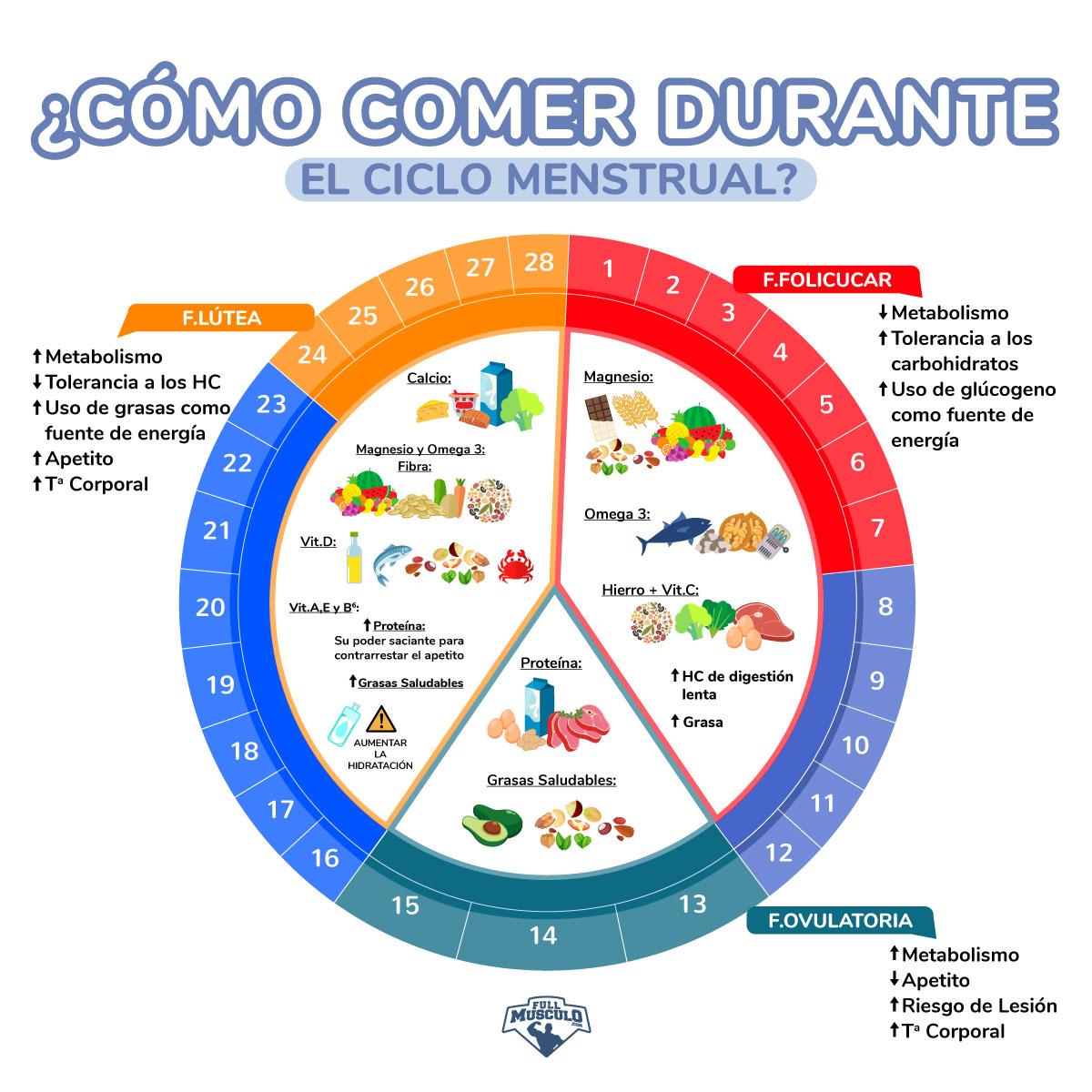 Dado que las imágenes son más fáciles de recordar que las palabras o cualquier dato expresado de forma escrita, os dejo la siguiente imagen sobre qué alimentos son más relevantes y lo que sucede en todo el ciclo menstrual.Conclusiones