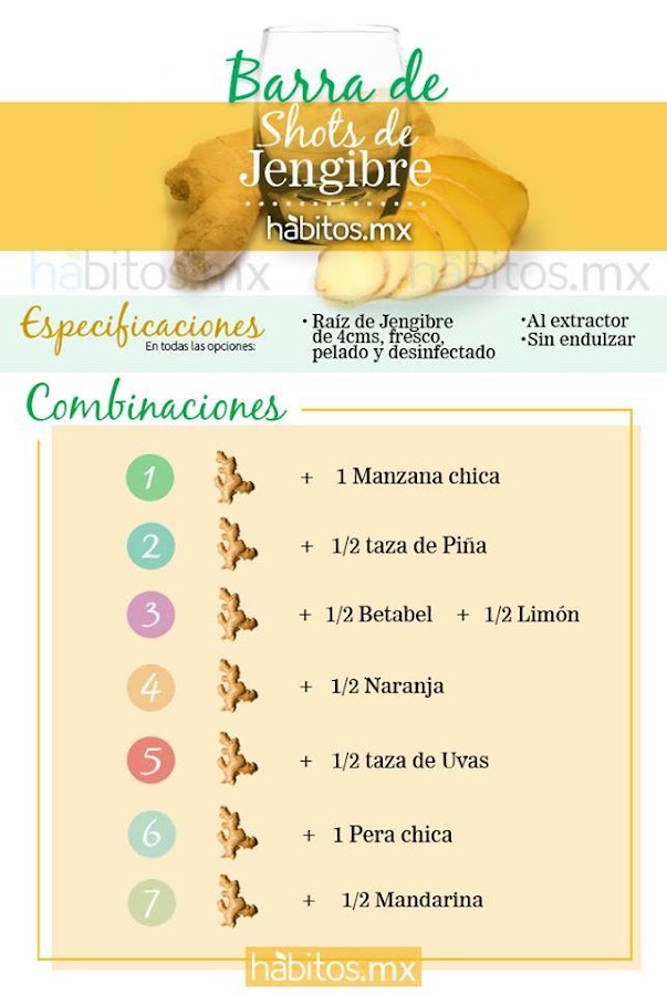 Se le llama shot, porque es muy poca cantidad de jugo; la suficiente, para darle al cuerpo y cerebro una pequeña, necesaria y natural dosis de azúcar, que lo ayuda a despertar sin buscar después otros estimulantes como la cafeína". Yo lo preparo con sólo media taza de piña o media porción de fruta (manzana, pera, uvas, naranja, etc.) y 3 ó 4 cms de jengibre (puedes empezar con un trozo más pequeño) en el extractor. ¿Quieres saber qué más puede hacer este brebaje? -da energía