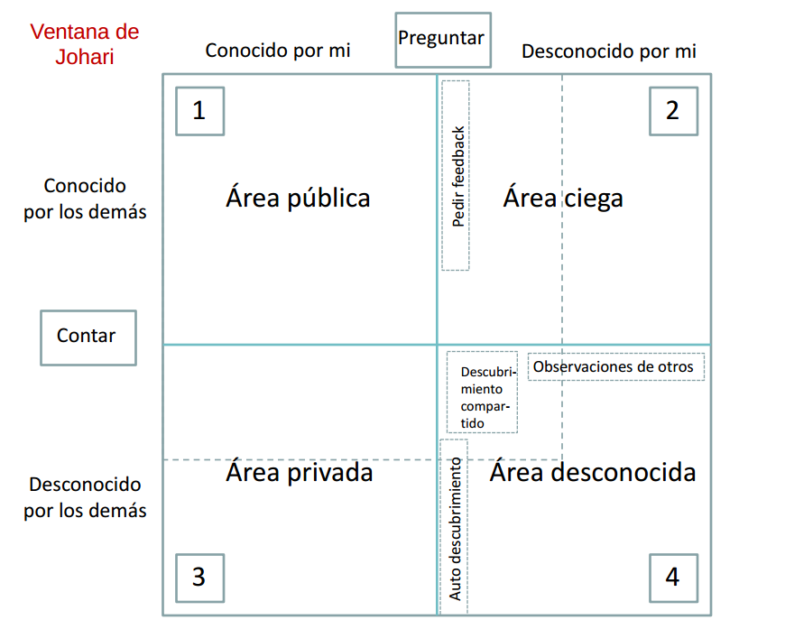 Lo ideal del feedback es darlo cuando alguien nos lo pide, porque es la manera de que la persona analizada no levante barreras defensivas. El cómo recibir el feedback daría para otro taller completo, pero Estefanía nos introdujo la Ventana de Johari. Ésta nos muestra cuatro áreas en nuestro espacio interpersonal: