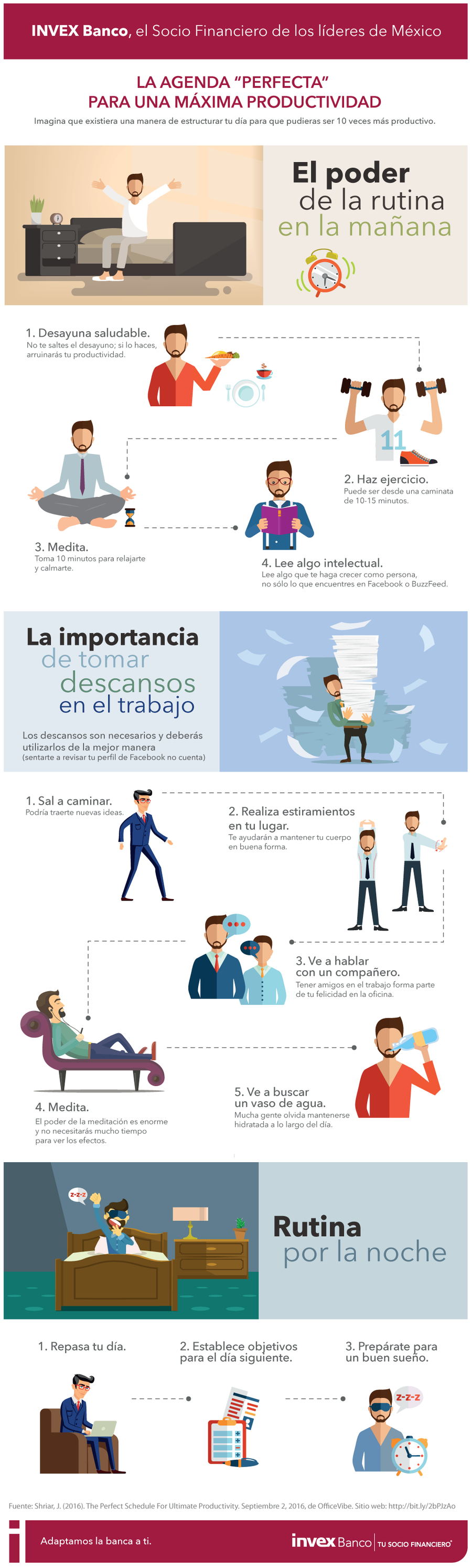 Pues existe una manera de estructurar tu día para lograr ser mucho más productivo. En esta genial infografía creada por INVEX Banco encontrarás la agenda perfecta para una máxima productividad.