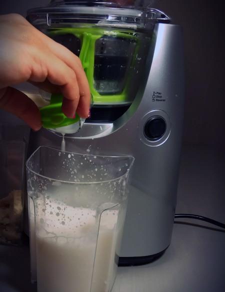 Con el extractor encendido irás echando las almendras junto con el agua (deja la mezcla unos 30 segundos dentro de la licuadora, antes de abrir el tapón de expulsión de líquidos).