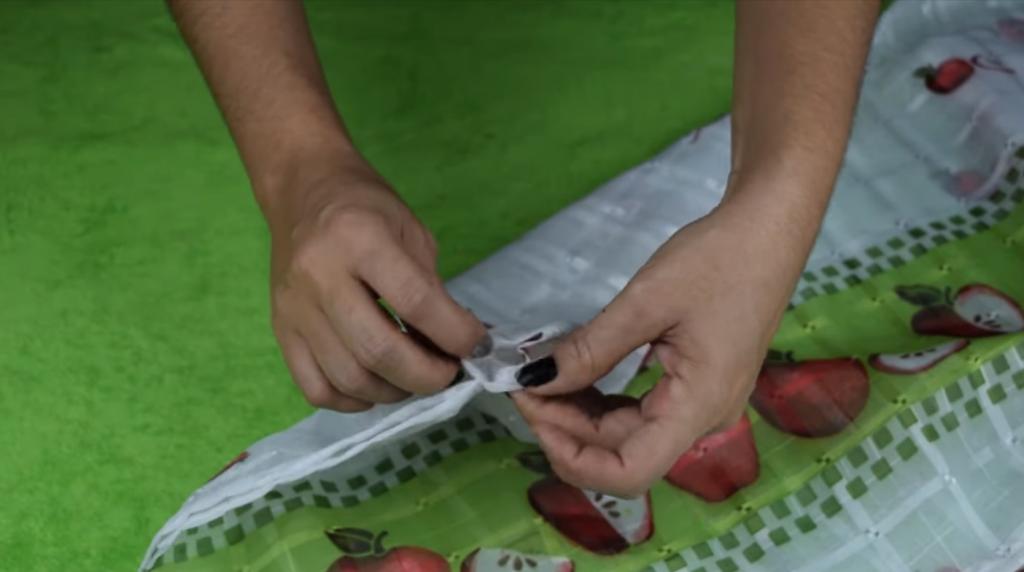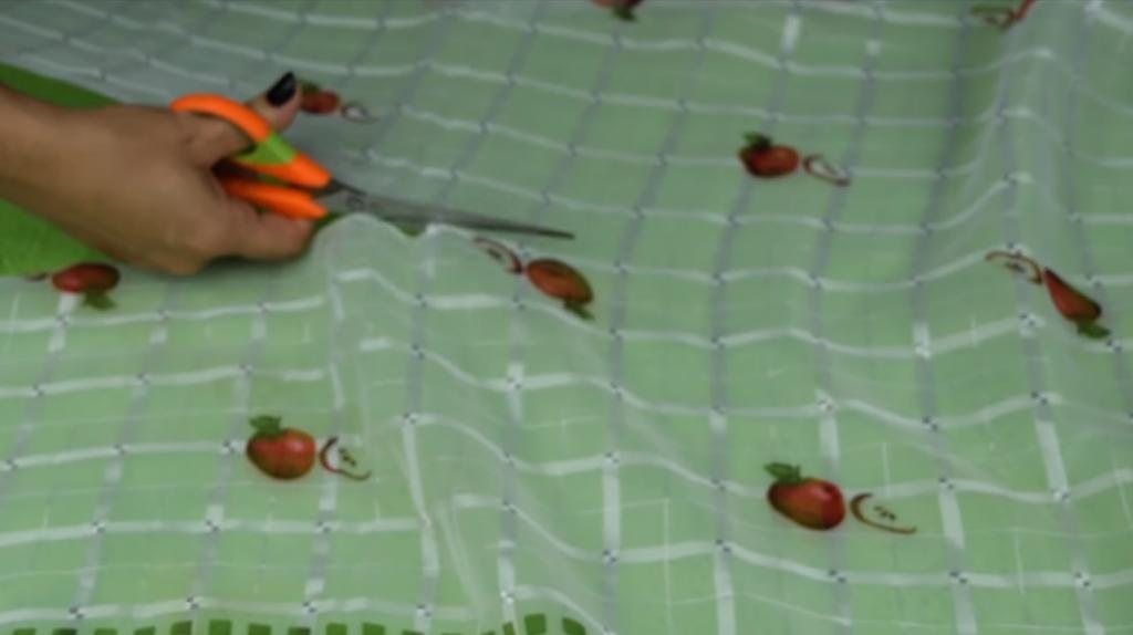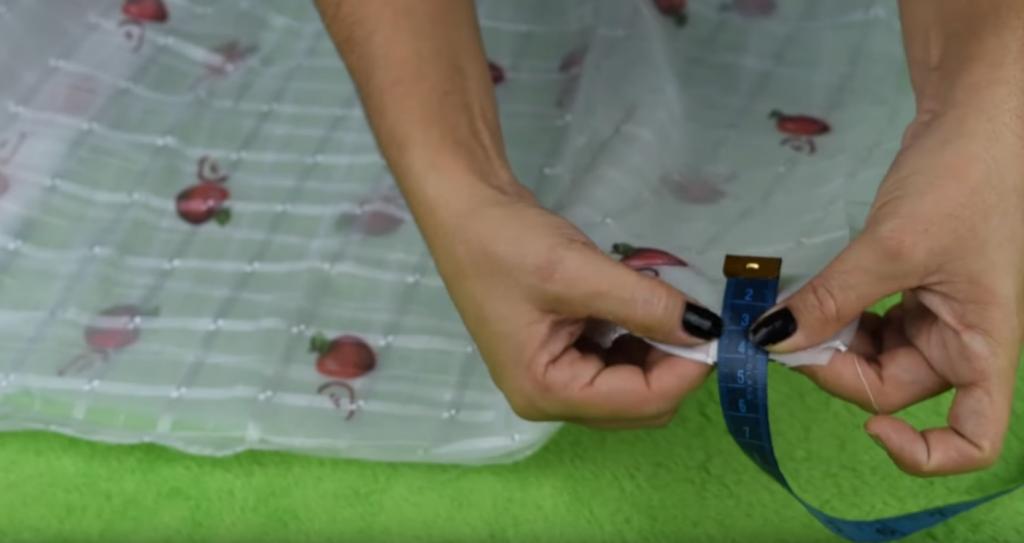 Lo primero que tenemos que hacer es ubicar la tela mencionada anteriormente sobre una superficie plana, la estiramos completamente y la vamos a doblar a la mitad para sacar una doble pieza. Tomaremos la cinta métrica y vamos a medir el largo de nuestra cortina (este con la medida que gustemos), por último, vamos a fijar con un alfiler de manera horizontal, este servirá como punto de referencia de la medida que hemos realizado.