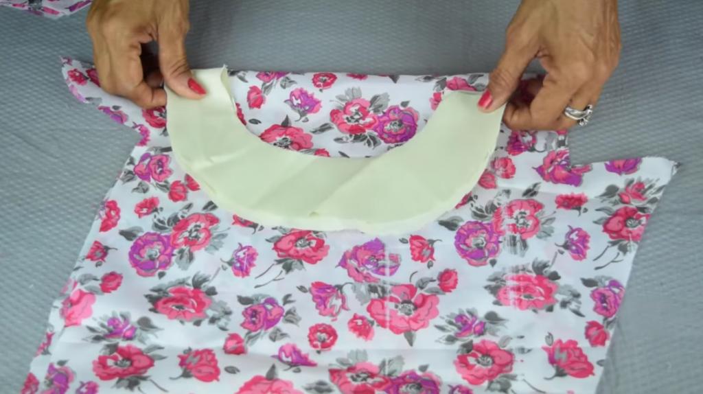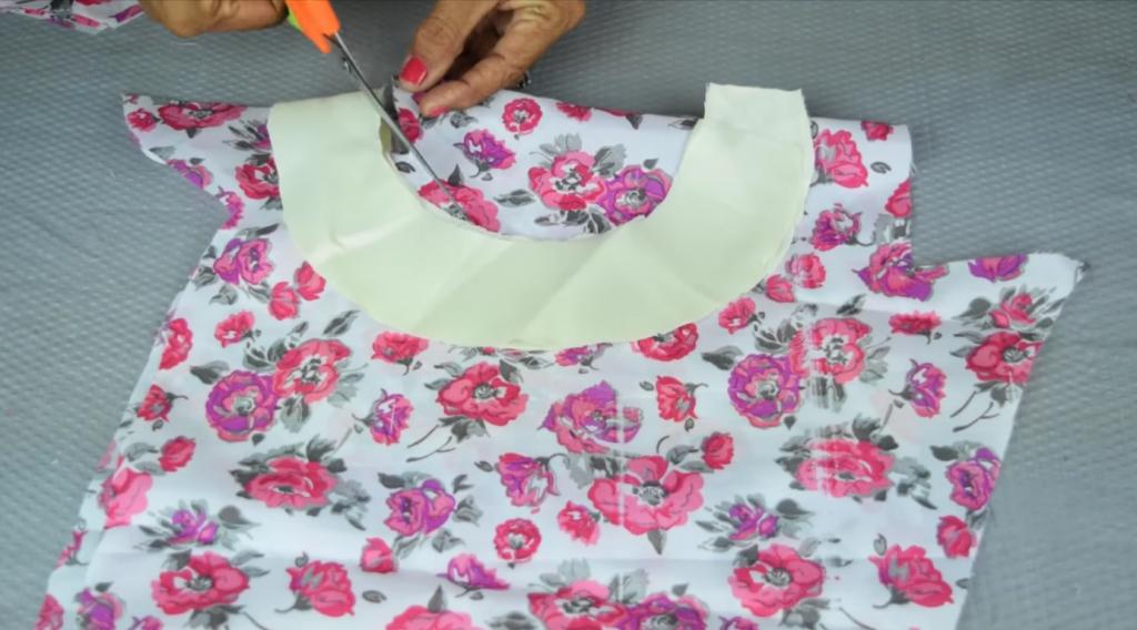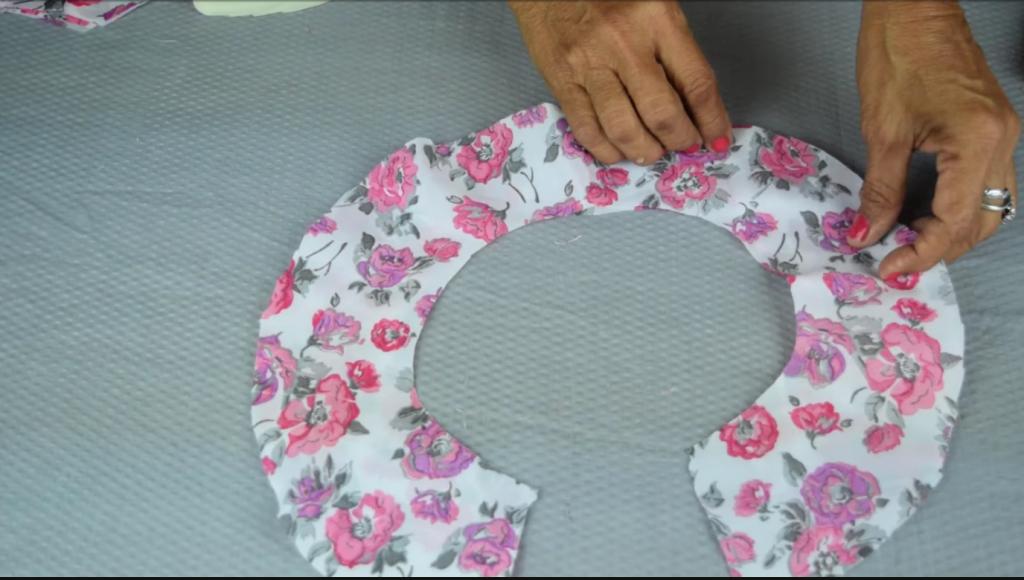 Recortamos una parte de la pieza del cuello para poder unirla junto a la otra pieza. Y sobre esta ubicaremos la otra pieza con los derechos enfrentados.