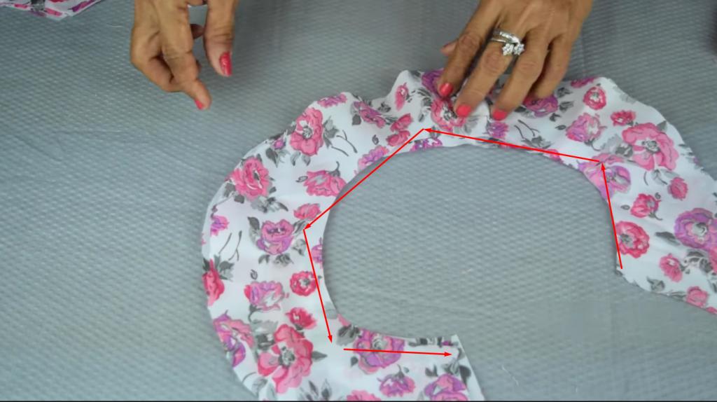Con retazos o alguna tela que haya sobrado de la anterior, procedemos a realizar un pequeño patrón o molde del cuello, nos debería que de quedar así.