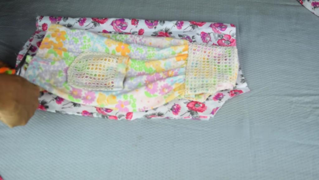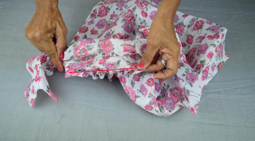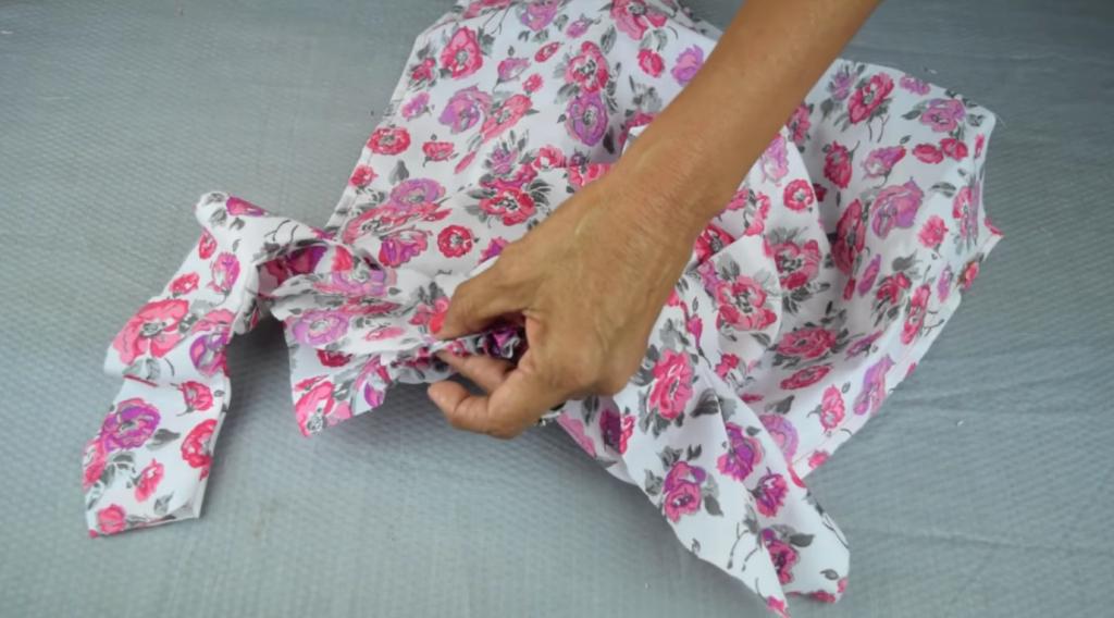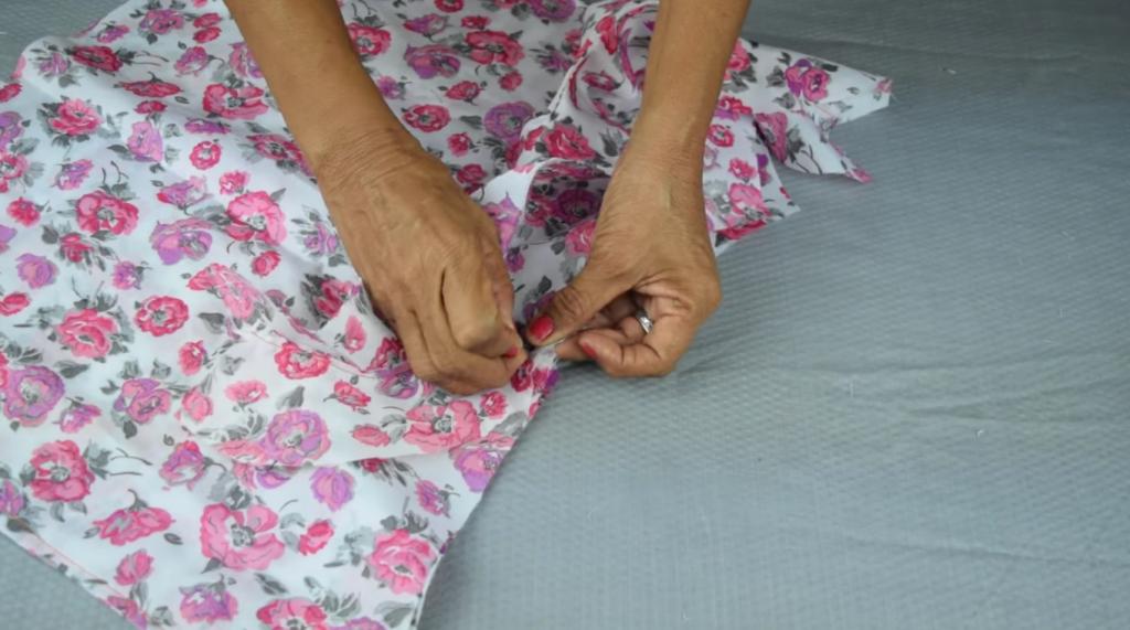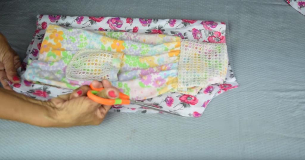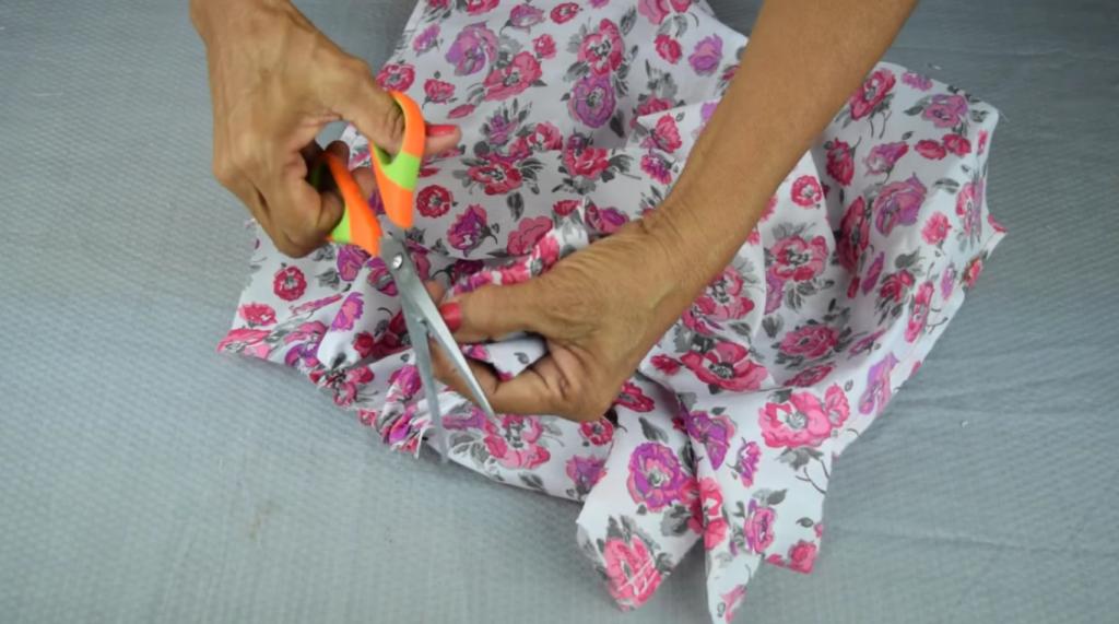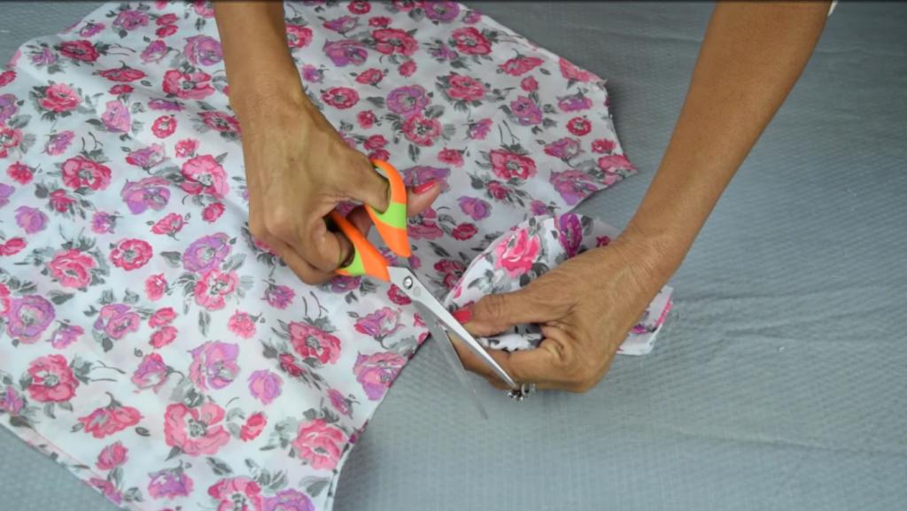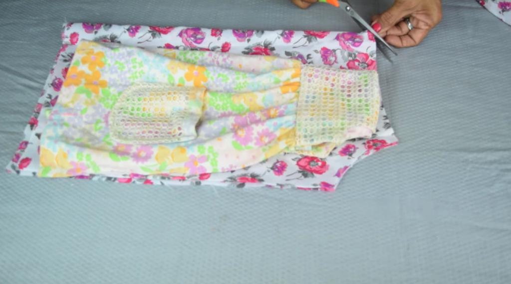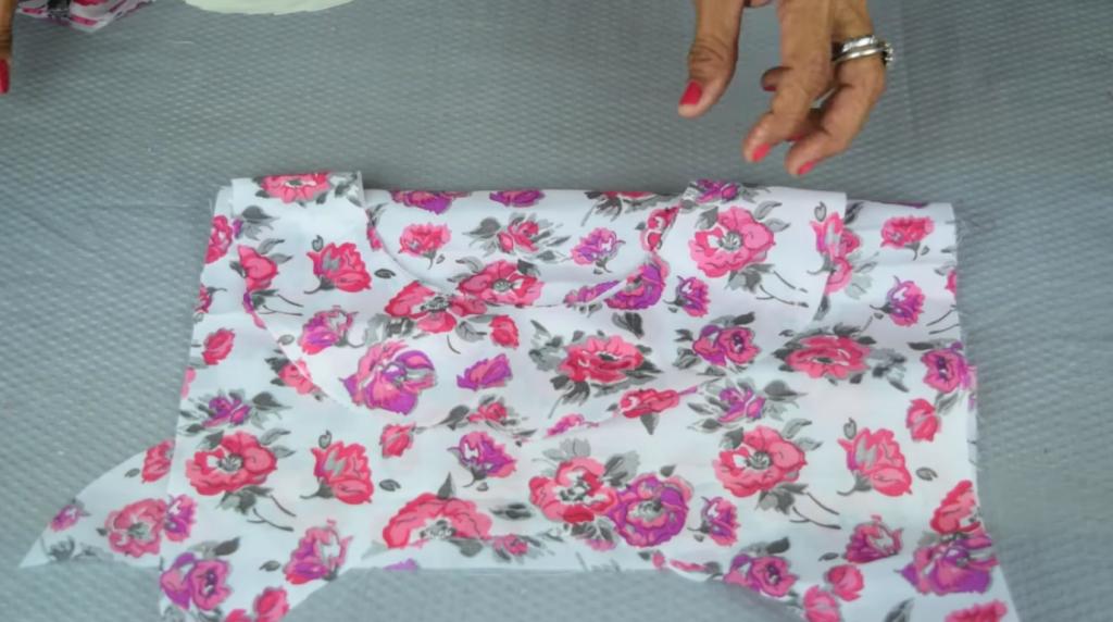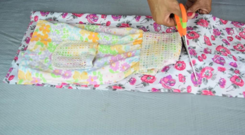 Lo primero que debemos hacer es colocar la tela (50 cm) a trabajar sobre una superficie plana y la vamos a doblar por la mitad, teniendo en cuenta esto, procedemos a ubicar el patrón que en este caso sería una pieza que tengamos vestido de niña para tomarlo de referencia. Y procedemos a recortar con tijeras para tela el borde de la pieza.