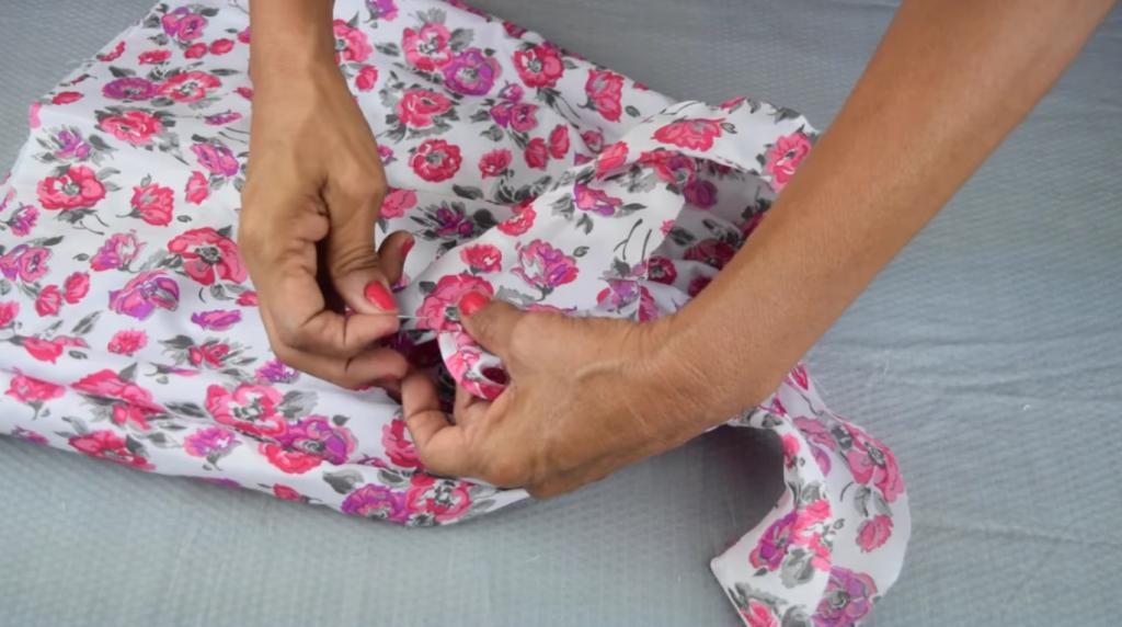 El sobrante de tela que nos ha quedado esta formará parte de la sisa, por lo que, vamos a realizarle un pequeño doblez en ambas para posteriormente fijar y realizar costura.