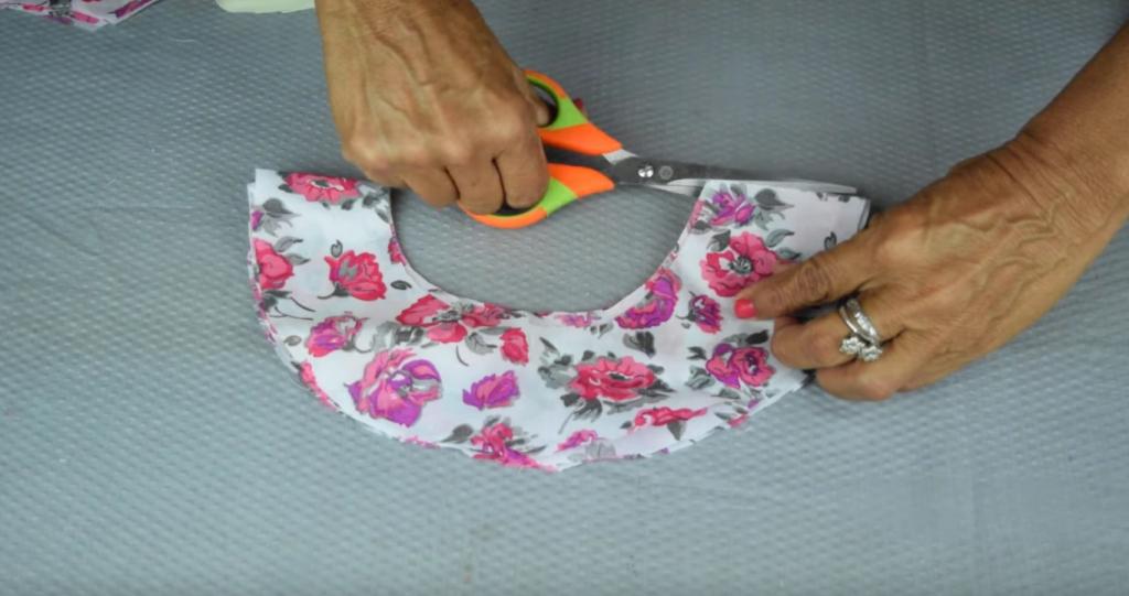 Haremos el mismo procedimiento en la otra parte, con la otra pieza del cuello que hemos realizado anteriormente, cabe destacar que esta la debemos de doblar y realizaremos un piquete con nuestras tijeras para tela en el doblez para marcar su centro.