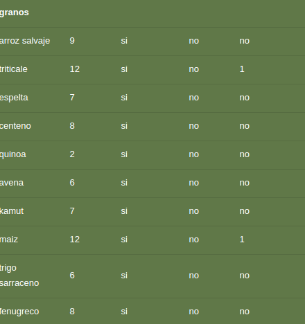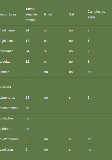 En esta tabla, pueden apreciar el tiempo ideal para ciertas legumbres o nueces, si requieren de algún medio ácido o salado y las veces que hay que cambiarle el agua durante el remojo:
