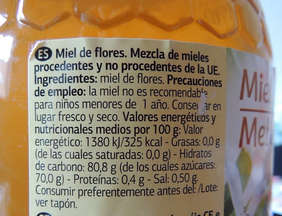 Aquí os muestro un ejemplo de miel de flores, la composición es bastante próxima a lo que marca la legislación, aun así no sabemos mucho más en detalle. Ausente de grasas y con alto porcentaje de hidratos de carbono, entre ellos de azúcares. No sabemos la procedencia, pero sí que es una mezcla de mieles, lo que no es adecuado.