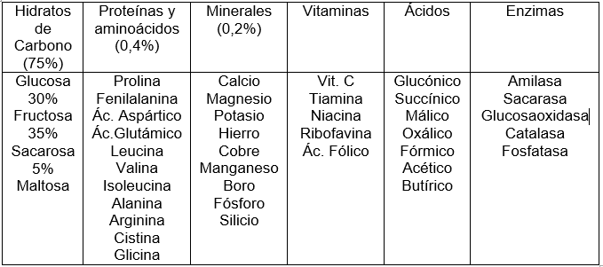 Depende de la especie de flor utilizada por la abejas para elaborar la miel, de la región y de las condiciones climáticas, pero una composición promedio sería la siguiente (quedando muchos más elementos por enumerar):