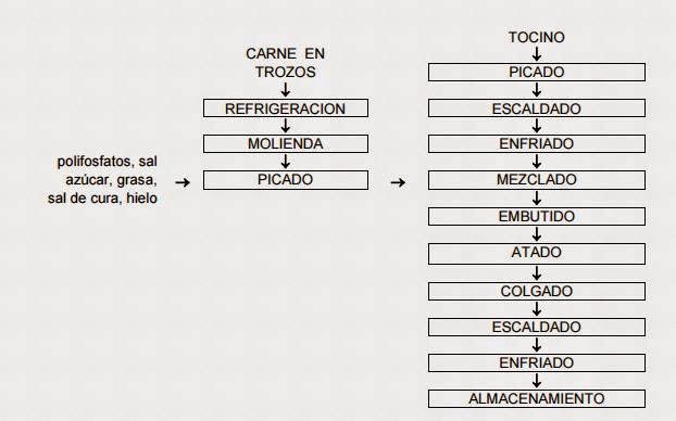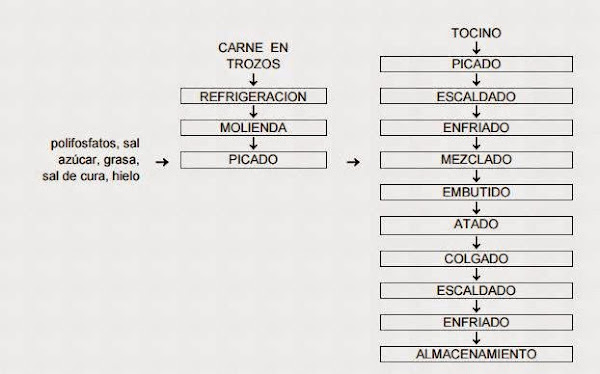 El tocino se pica en cubitos de 1 cm y se escalda en agua a 75°C hasta que adquiera un aspecto vidrioso, posteriormente se deja enfriar y escurrir. La carne fragmentada y refrigerada se muele en molino con agujeros de 5 mm de diámetro. En este primer proceso, un picado excesivo puede causar problemas de ligado, aumentar la temperatura e inhibir la emulsificación.