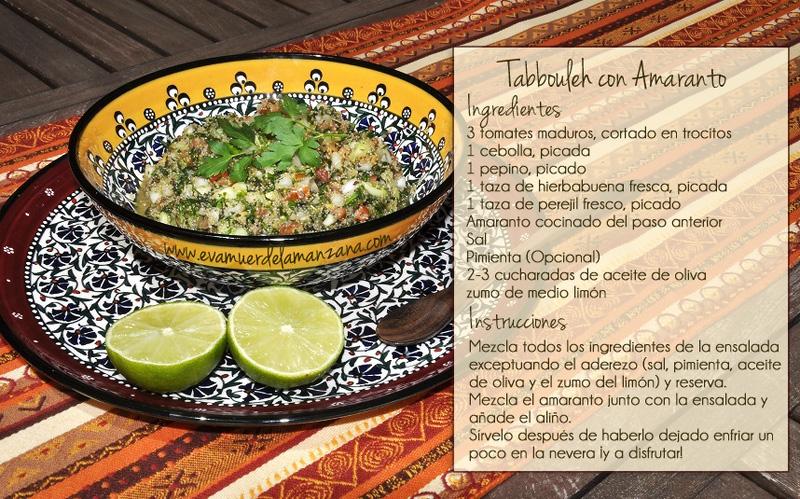 Cuando empiezo a ver a mis gatas tiradas por el suelo, ya es señal de que el verano anda cerca. Y según van aumentando las temperaturas, también suelen aumentar las ganas de comer algunos platos más frescos y ligeros. Por ello, cuando hace un par de semanas vi que una de las más fieles seguidoras del blog además de muy buena cocinera (si no me equivoco ha hecho casi todas las recetas que he publicado por aquí) subió una foto de un tabbouleh que había preparado con amaranto en grano al grupo de Facebook de #miretopaleo no dudé ni un momento en pedirle que compartiera su receta con todos los lectores de Eva Muerde La Manzana. Si quieres saber más sobre el amaranto, te dejo el enlace a una receta que publiqué el año pasado utilizando este ingrediente, en la que comparto algunas de sus características nutricionales.