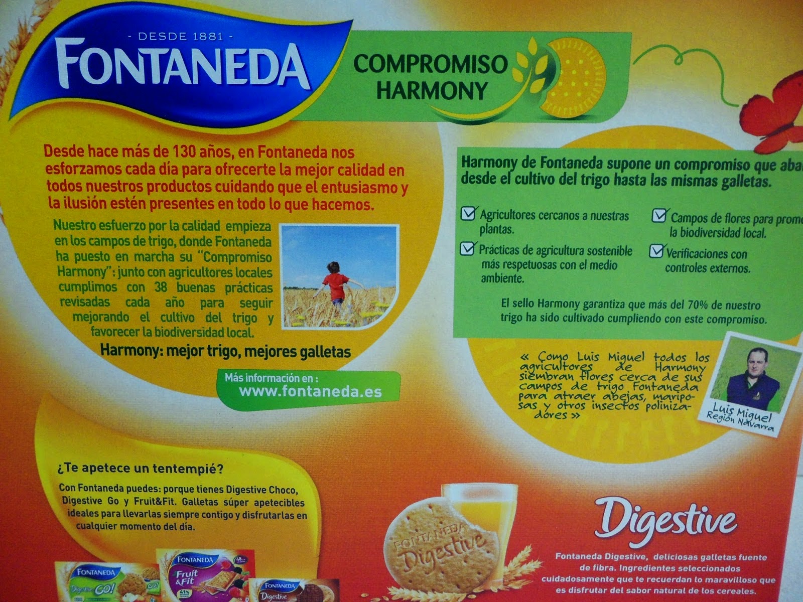El Compromiso Harmony es un proyecto que se sustenta en la obligación que Mondelez adquiere con los agricultores locales de trigo y con los propios consumidores de preservar la biodiversidad, limitar el impacto medioambiental y mejorar la calidad de la producción de trigo que utiliza en las principales variedades de sus galletas Fontaneda que se producen en España y se lleva trabajando desde 2011.
