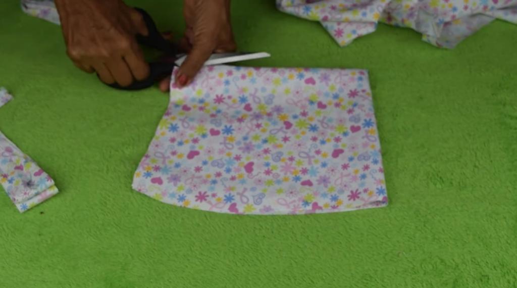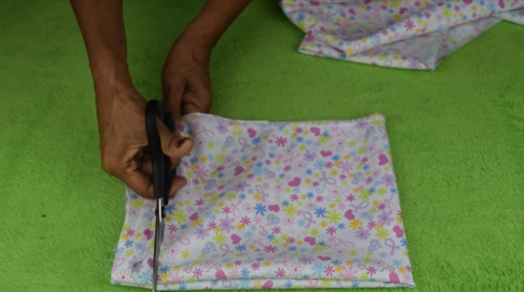 Lo primero que debemos de hacer es colocar la tela de tipo loneta sobre una superficie plana, esta la vamos a doblar en 4 es decir, un doblez al medio y luego un doblez al vertical para formar una pieza cuadrada. Realizado es doblez procedemos a recortar con tijeras para tela, de tal manera que formemos la pieza cuadrada.