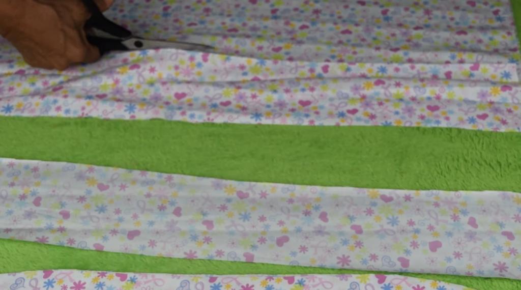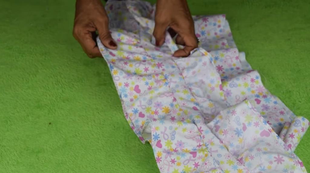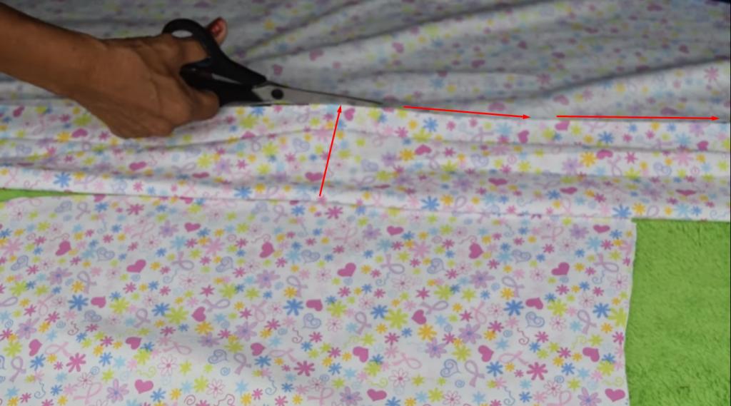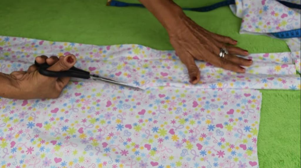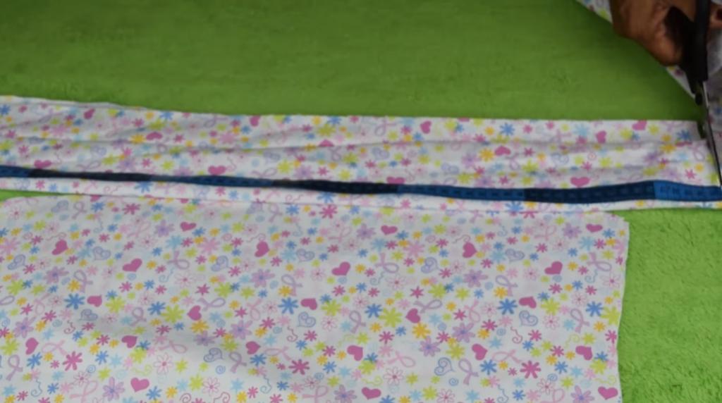 Lo siguiente que haremos será tomar la pieza de tela sobrante (de este mismo tipo) y realizaremos un doblez con una altura de 10 cm aproximadamente con el ancho aproximado de nuestra falda, procedemos a recortar esa altura de 10 cm.