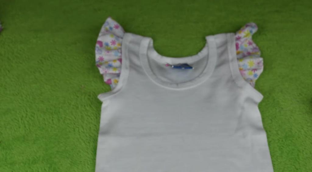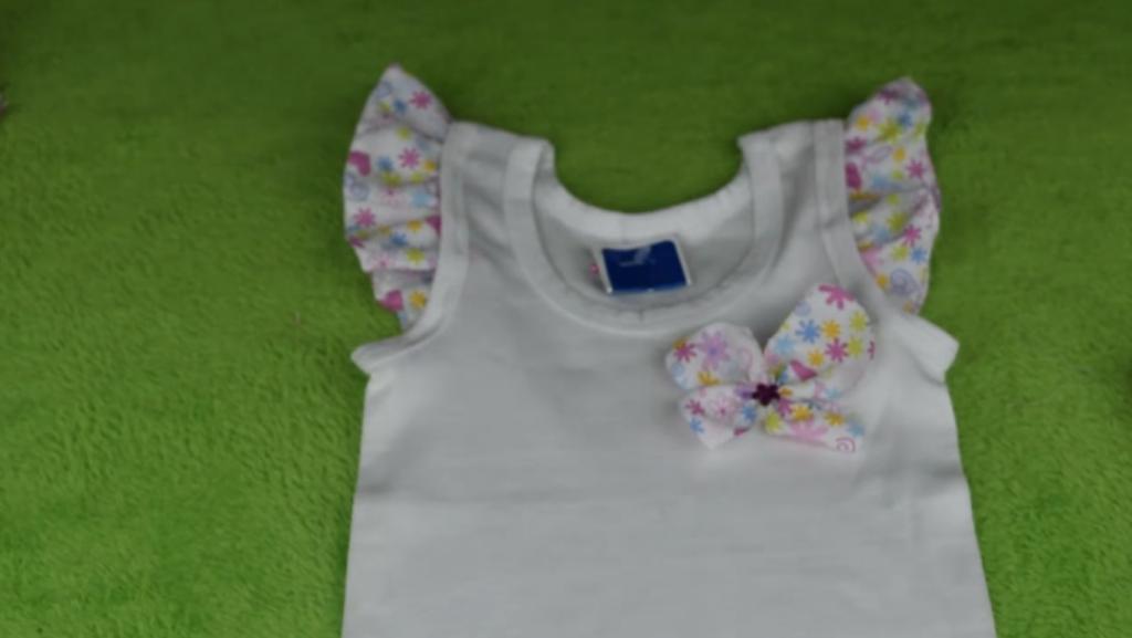Tomaremos la franellila que he pedido en los materiales y esta en especial solo le vamos a hacer un diseño más vivo y bonito, por lo que vamos a recortar dos tiras de tela y esta las vamos a colocar en las mangas de la franelilla, de igual manera con un estilo de fruncido.