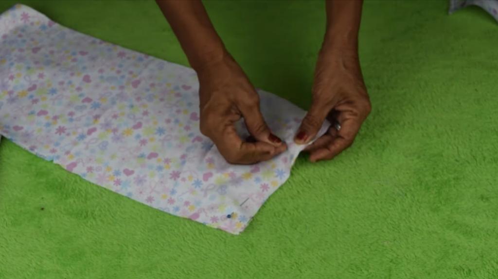 Tomaremos la pieza principal y colocaremos una de estas piezas de tela sobre esta pero ambas con los derechos enfrentados, procedemos a fijar con alfileres los laterales de la pieza y realizamos un pespunte lineal o sencillo.