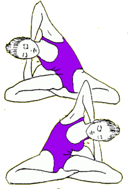 Armar la postura. Sentarse con el tronco derecho y las piernas abiertas. Flexionar la pierna derecha y apoyar el pie en la parte interna del muslo izquierdo. Inhalando, llevar los brazos hacia arriba y exhalando, girar el tronco hacia la izquierda y dejarse caer sobre la pierna. Reiterar el ejercicio al otro lado. Repetir tres veces sobre cada pierna.