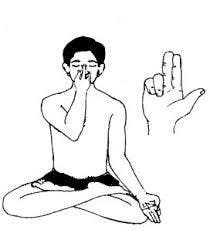 Exhalar todo el aire. Lleva tus dedos índice y mayor al entrecejo en Chin mudra. Tapar la narina derecha con el dedo pulgar e inhalar y exhalar a través de la fosa nasal izquierda durante 20 respiraciones aproximadamente ( de 5 a 7 minutos). Si la narina izquierda está bloqueada, Inhalar por derecha y exhalar por izquierda alternadamente hasta que se abra la fosa nasal. El mismo ejercicio se puede realizar tapando la narina izquierda y respirando por la fosa nasal derecha para activar la energía corporal. Esta práctica respiratoria, conocida como Anuloma Viloma o Nadhi Shodhan pranayama se puede realizar también alternadamente (primero por una fosa nasal y luego por la otra). Este tipo de pranayama o respiración controlada contribuye a regular las alteraciones de la respiración, fortalece una expulsión más efectiva del Dióxido de Carbono y calma la mente.