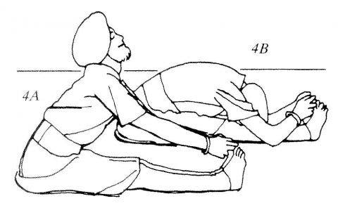 Sentarse con las piernas estiradas hacia delante. Estirar bien la espalda e inhalar subiendo los brazos. Enderezar la columna vertebral y apoya bien los isquiones. Exhalar e inclinarse hacia adelante. Mantener la postura por dos o tres minutos. Incorporarse. Esta postura es muy beneficiosa, pues, estimula los órganos abdominales y digestivos, aumenta los movimientos peristálticos aliviando el estreñimiento, regula el funcionamiento del páncreas, y es de gran ayuda para quienes sufren diabetes o hipoglucemia.