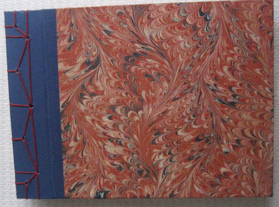 Por fuera, un toque vintage pero colorido con papel marmoleado en tonos azules y granates. Encuadernación japonesa, con hilo rojo sobre la tela azul. Y con el mismo hilo, he puesto su inicial en la portada, para darle un toque personal.