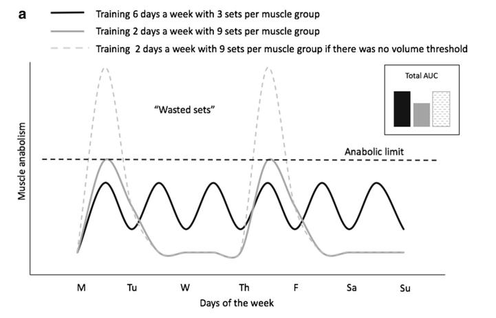 En un estudio de revisión de Dankel et al. 2017 (1) se estableció como conclusión más interesante que en el entrenamiento tenemos lo que él mismo llama como un “límite anabólico” por sesión.