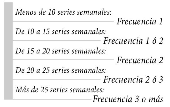 En este caso, nuestro compañero iniciado puede utilizar la frecuencia de entrenamiento para dividirse ese volumen mínimo en varios días que le permitan no sobrecargar al músculo.