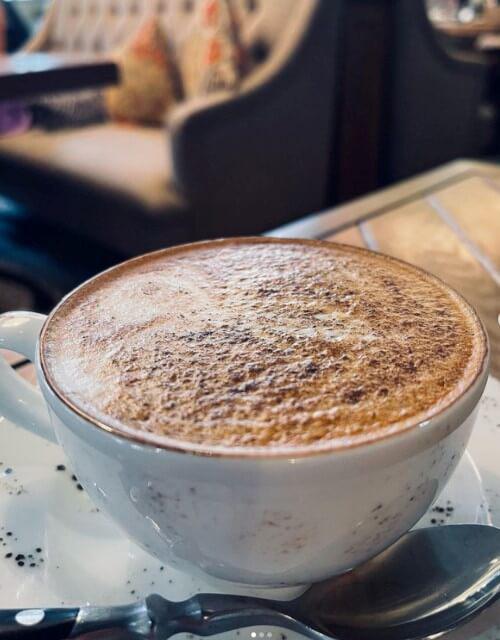 Suele servirse en tazas de cerámica para conservar el calor y espolvorear cacao o canela molida por arriba.