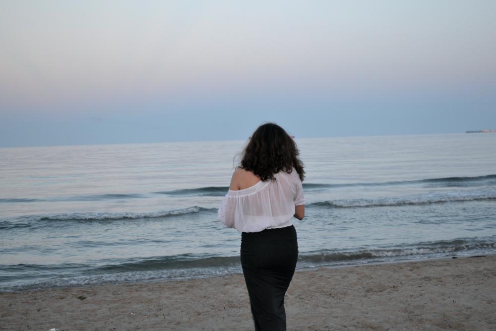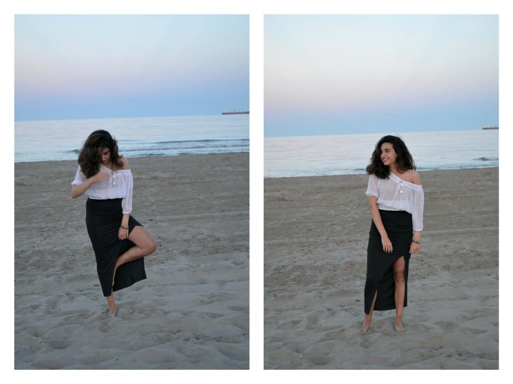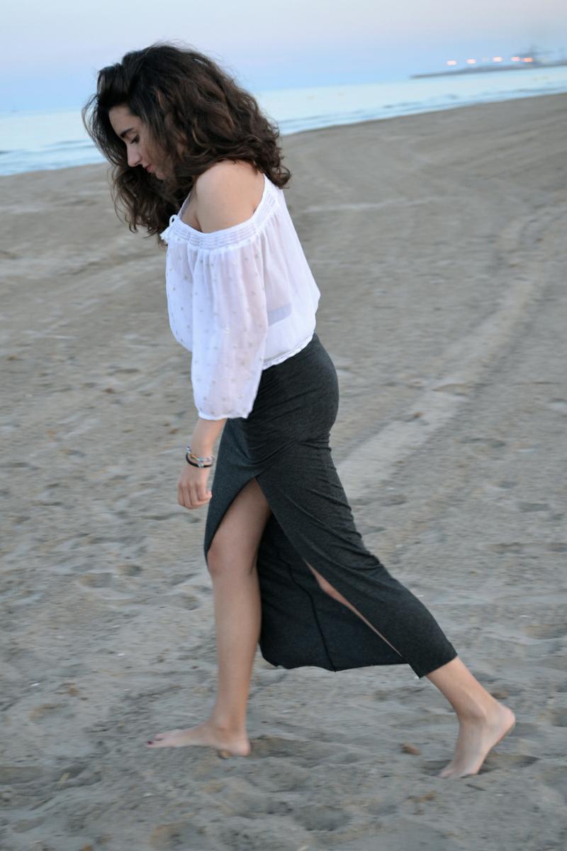 En este primero, combino una blusa transparente blanca de HOLLISTER con pequeñas estrellitas plata por toda la blusa con una falda larga gris (ZARA) con una abertura en el lateral.