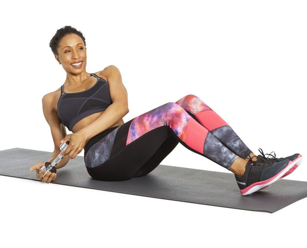 Sentarse con las rodillas dobladas, los talones hacia abajo y los dedos levantados. Mantenga el peso con ambas manos extendidas en línea con el pecho. Inclinarse hacia atrás para que el torso este en un ángulo de 45 grados. Brace núcleo y gire hacia la izquierda en la medida de lo que pueda (como se muestra). Hacer una pausa, a continuación, girar a la derecha. Eso es una repetición; no 10. Para proteger su cuello mientras lo hace, imagine que usted está sosteniendo una manzana entre la barbilla y el pecho.