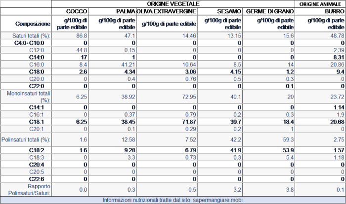 PRO – … Os dejo esta tabla porque es de las más concretas en cuanto a las cadenas de ácidos grasos de los aceites. Recordad que “burro” en italiano es mantequilla…. no vayamos a confundirnos.
