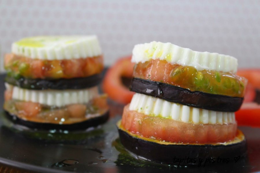 Esta receta que nos trae el blog Tapitas y Postres es muy fácil de elaborar y bastante saludable, berenjenas, queso y tomate superpuesto ya aderezados con una salsa que ella te explica en su blog lo hace una receta exquisita, y no me digáis que no tiene una presentación bonita…Vamos quedamos como gourmets. Puedes ver más detalladamente su elaboración a continuación: