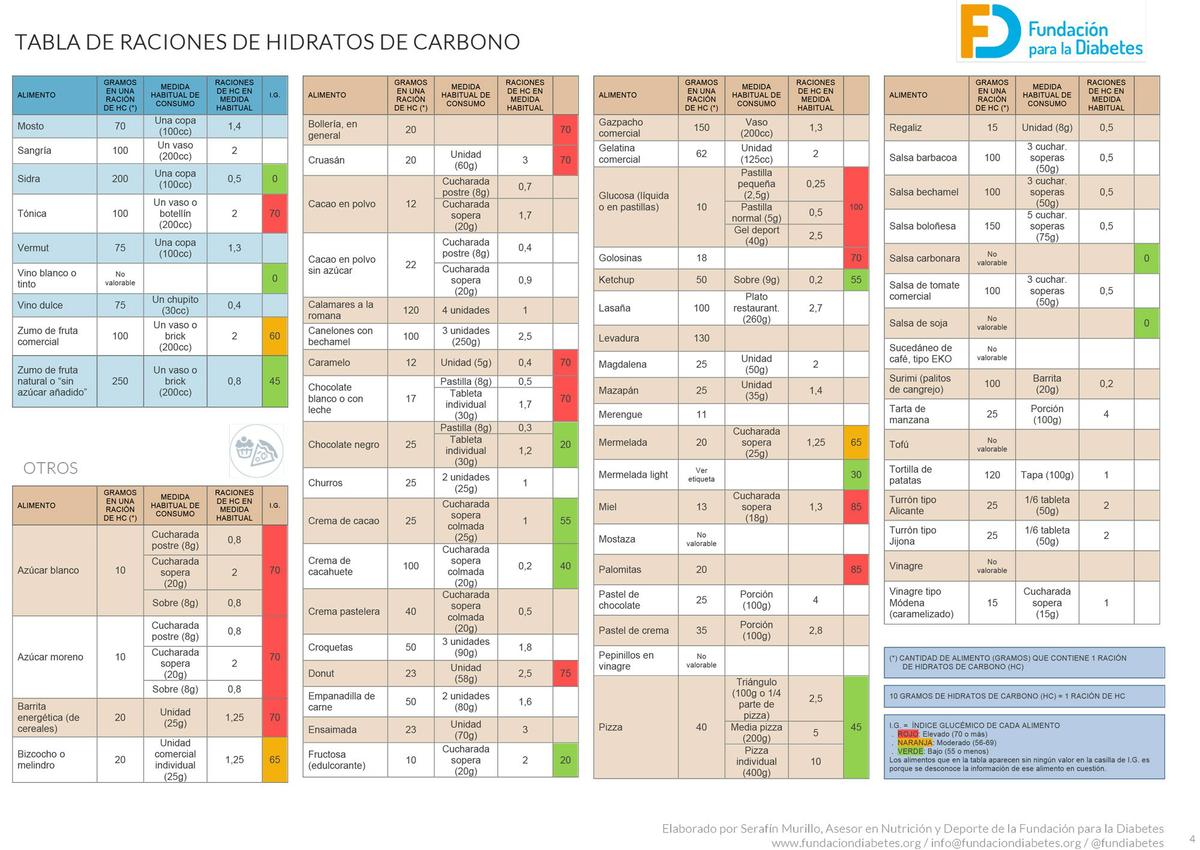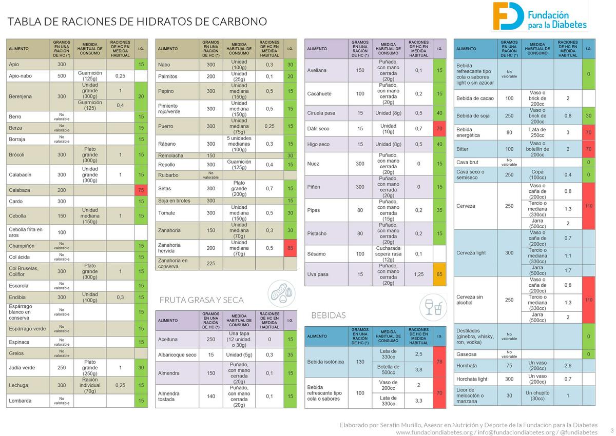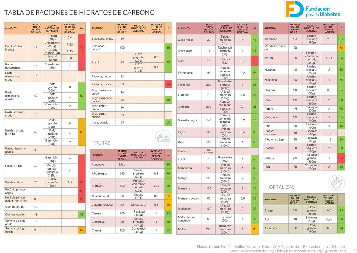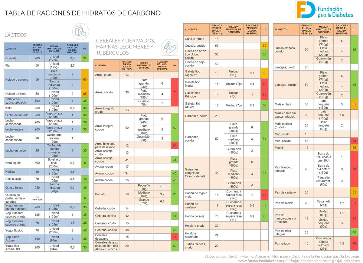 Os dejo el enlace de la web Fundación diabetes con la tabla de índice glucémico de los alimentos. Es muy completa y allí podréis descargaros las tablas.