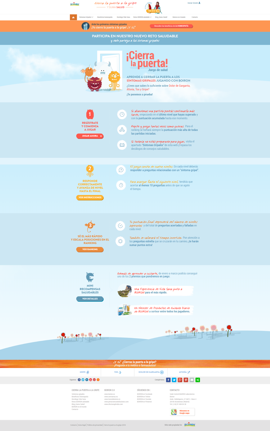 Laboratorios BOIRON acaba de lanzar una nueva campaña de concienciación basada en el principio de "aprender jugando". Para ello ha creado el juego online ‘¡Cierra la puerta a la gripe!’, con el que además de descubrir cuánto sabes sobre la tos, la afonía o la gripe, también podrás aprender conceptos y hábitos saludables que te ayudarán en esta época del año. ¡Prueba el juego y aprende a la vez que te diviertes entrando aquí!
