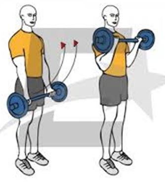 1. Curl con barra de pie: Se trata de un ejercicio intermedio pues la mayor parte de la tensión en bíceps se da en medio de cada repetición. Es de suma importancia no balancearse en este ejercicio, ni ayudarse con las piernas. Para ello debemos sacar un poco el pecho, mantener postura firme con espalda recta, y las rodillas ligeramente flexionadas. Separamos los pies al ancho de los hombres, y nada de pegar un saltito para lograr subir la barra, NO. Esto es todo movimiento de brazo, pura flexión.