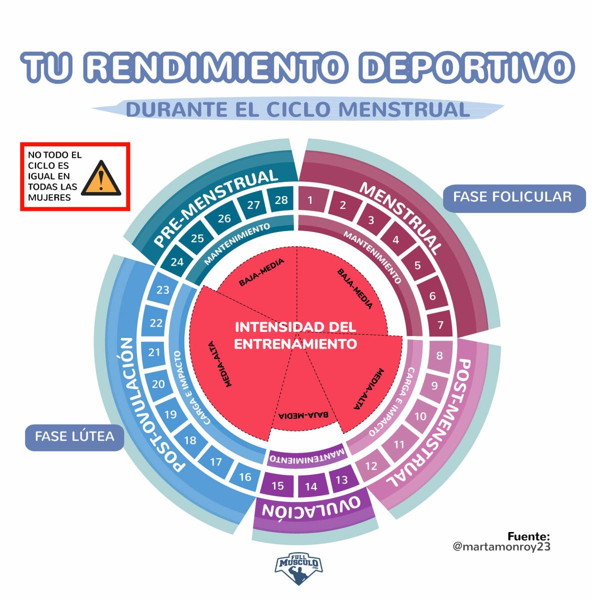 Las fases post-menstrual y post-ovulatoria asumen mejor los entrenamientos de mayor intensidad, por tanto, podemos alternar con entrenamientos menos exigentes en las fases de tensión fisiológica (ovulatoria, premenstrual y menstrual).