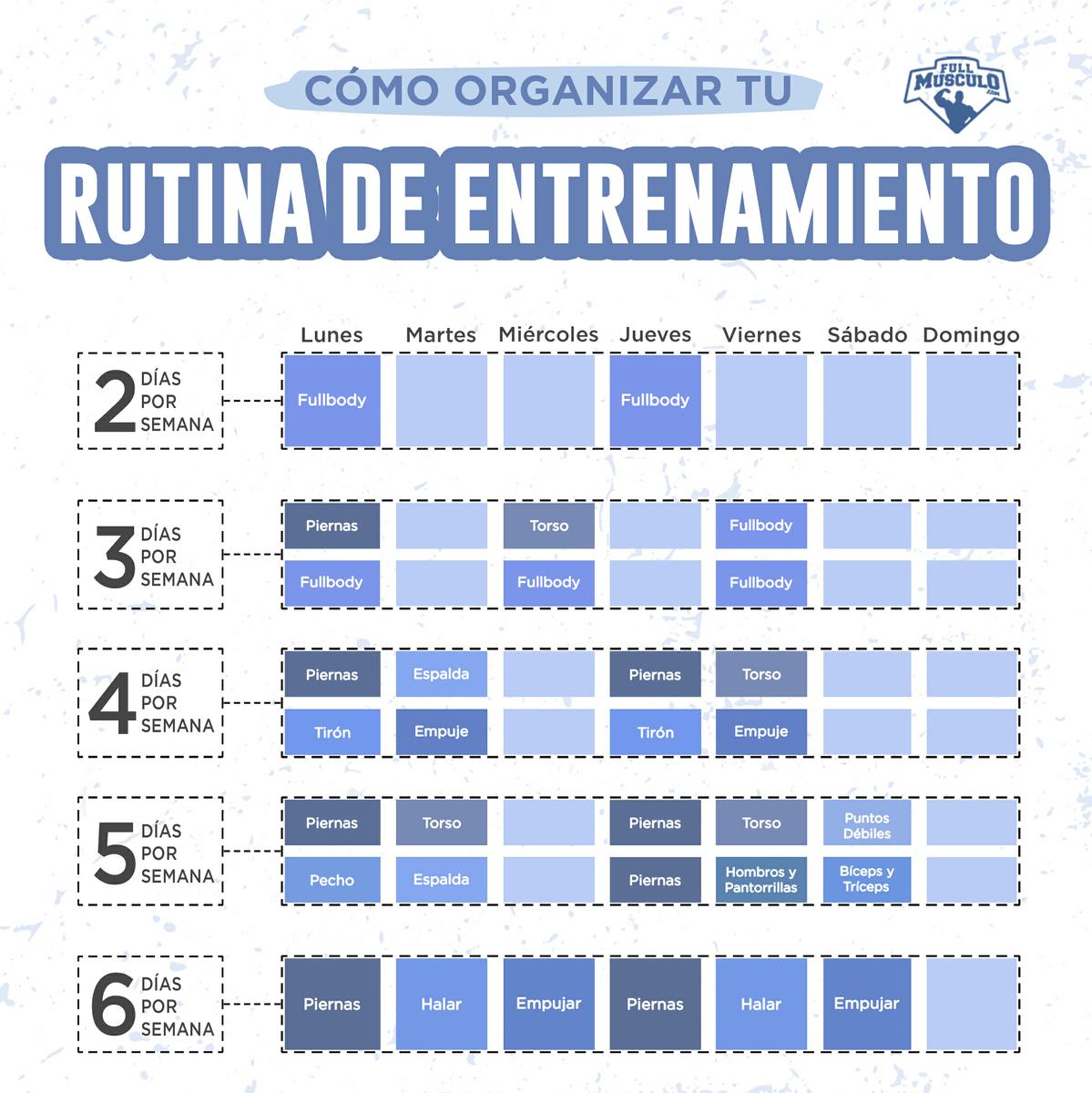 Para hacerte el trabajo más fácil te haremos algunas recomendaciones sobre como podrías organizar tus entrenamientos según los días que tengas disponibles cada semana: